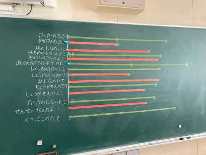 「はしをそろえて」「まっすぐ伸ばす」と、長さの違いがひと目でわかりやすいということがわかりました。班で協力して、調べることができましたね♪