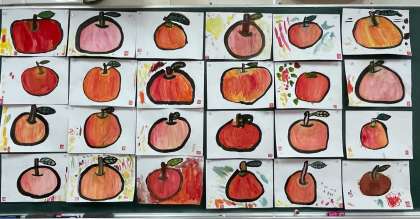 今日の図工では1組に続いて2組もリンゴに色を塗りました。