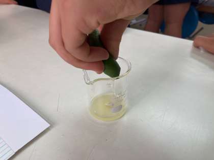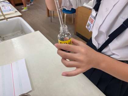 今日の理科の学習では、身近な食べ物や飲み物が、酸性なのかアルカリ性なのかどうかについて調べました。家から持ってきた野菜や果物を使って調べました。スダチやオレンジを絞って果汁を採取したので、理科室がとても良い香りに包まれました。果物や野菜等ご準備いただきありがとうございました。