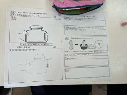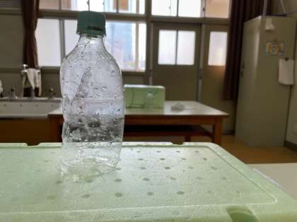 4年生の理科の時間の様子です。今日はへこませたペットボトルをお湯に入れ、ペットボトルがどうなるのかを実験しました。