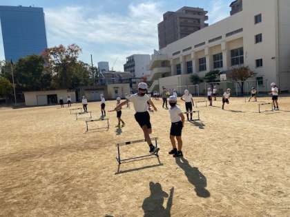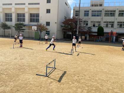 体育科の学習でハードル走をしています。グループに分かれて、跳ぶときの歩数やフォームを確認しながら練習をしていました。
