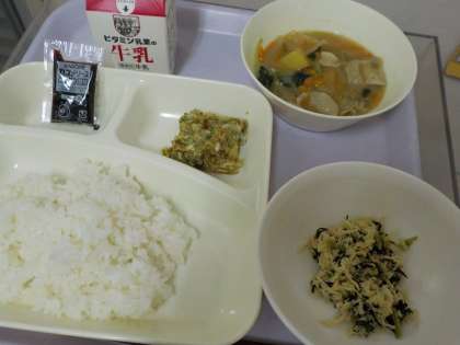 今日の給食は、ごはん・牛乳・お好み焼き・豚汁・とりなっ葉いためです。