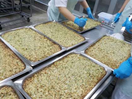 焼いた後は調理員さんが、1枚ずつカットしてクラスに分けてくださっています。