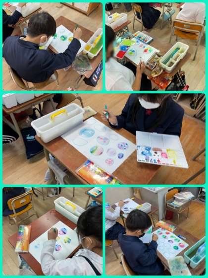 今日の図工では、絵の具の「たらしこみ」の技法でシャボン玉を描きました。