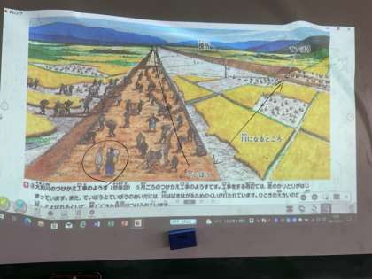 4年生の社会科の時間の様子です。淀川のつけかえ工事と違って、大和川のつけかえ工事は全て手作業で行われていましたね。それも8ヶ月で完成したので、みんな「え〜!」と驚いていました。