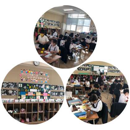 図工でクリスマスカードを作りました。開くと飾りがせり出すようにして、サンタやリース、プレゼントなどを上手に色画用紙で作りました。メッセージも書いて、届けるのを楽しみにしながら作っていました。