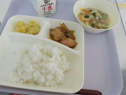 今日の献立は、ごはん・牛乳・かす汁・鶏肉の甘辛焼き・栗きんとんです。
