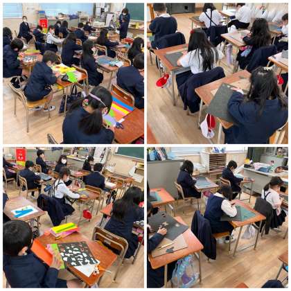 図工で、初めてカッターナイフを使いました。けがをしないようにドキドキしながら、初めて使うものなので、わくわくしていました。黒の画用紙に窓をあけて、裏から色画用紙を貼っていきます。カラフルな「夜のけしき」ができ上がりました。細かく切り込みを入れたり、おもしろい形を切ってみたり、いろいろな工夫をしてカッターナイフを使いこなして、「もっといろんな切り方をしてみたい!」と言っていました。