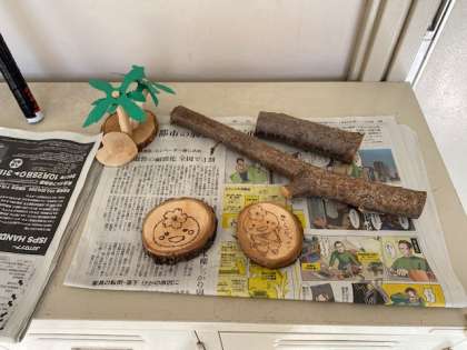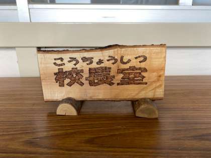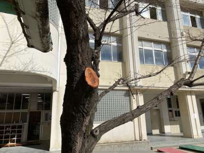1年生の教室前にある桜の木の枝がのび、通るときに当たる高さまで下がっていたので、その枝を切りました。そして、管理作業員さんが、切り落とした枝を利用して、素敵な作品をいくつも作っています。置いておくだけで、おしゃれですね。