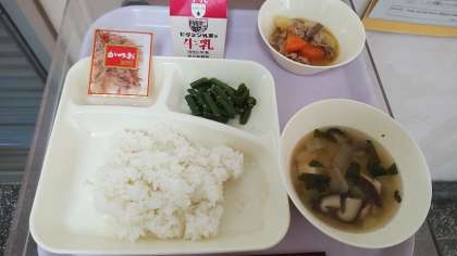今日の献立は、ごはん・牛乳・変わり肉じゃが・鶏肉と白菜のすまし汁・さんどまめのごまあえです。