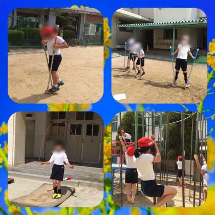 竹馬、一輪車、なわとび、のぼり棒などに取り組み、合格を目指しました。