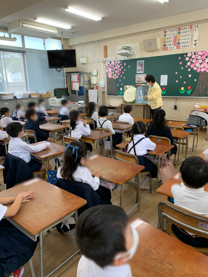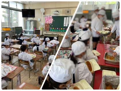 今日は、さくぽんさんに読み聞かせしていただきました!みんな楽しそうに聞いていました。給食は6年生に手伝ってもらっています。初めてのことにも頑張って取り組んでいます!!