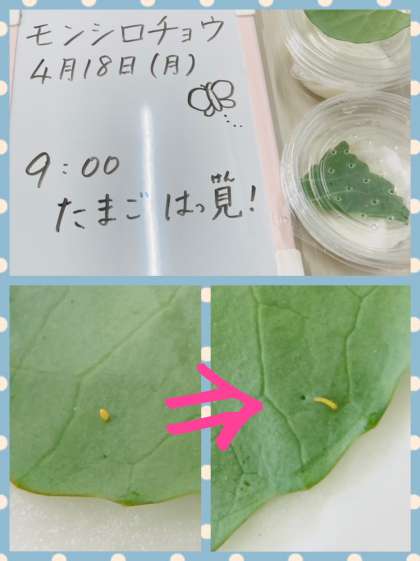 月曜日に、桜宮小学校の学習園のキャベツにモンシロチョウが卵を産んでいるのを発見して、観察をしていました。