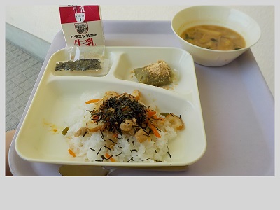 牛乳、かやくご飯、じゃがいものみそ汁、まっ茶ういろう