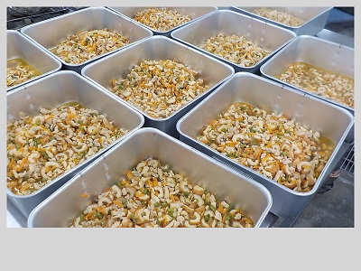 かやくご飯の具は、鶏肉・にんじん・ちくわ・さんどまめを、砂糖・