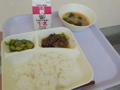 ごはん、牛乳、プルコギ、とうふとわかめのスープ、きゅうりの甘酢づけ
