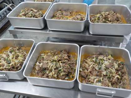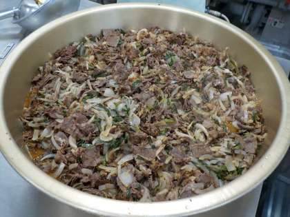 今日は、韓国料理の「プルコギ」が登場!韓国語で「プル」は「火」、「コギ」は「肉」という意味です。給食では牛肉に下味をつけた後、野菜と一緒にオーブンで焼いています。ごはんの進むおかずですね(^^)