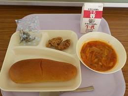 黒糖パン、牛乳、一口トンカツ、ミネストローネ、ミニフィッシュ