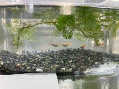 授業の初めは、メダカのめすのお腹にたまごがついていました。その様子を観察している途中で、水草にたまごを産みました。元気なメダカがたくさんたまごを産んでいます!