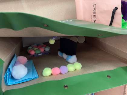 3年生の図工科で作っている作品です。ふくろの中には自分だけの世界が!オリジナリティ溢れる可愛らしい作品ができそうです('ω')
