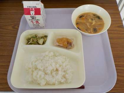 ごはん、牛乳、鶏肉のおろしじょうゆかけ、みそ汁、野菜いため