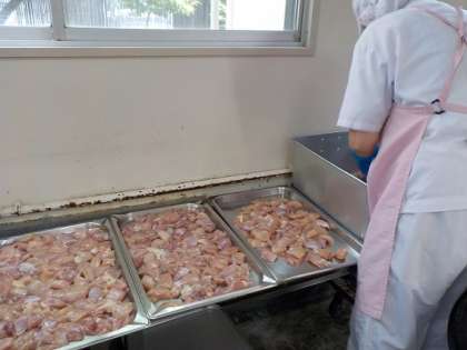 お肉(生)担当の調理員さんは、ピンク色のエプロンを着て調理をしています。