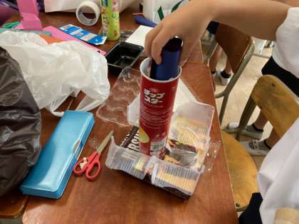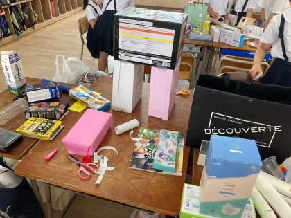 お菓子の箱やジュースのペットボトルなどを組み合わせて、おもちゃ作りをしました。「みて〜ロボット。」「キリンを作る。」など創造豊かに作成していました。
