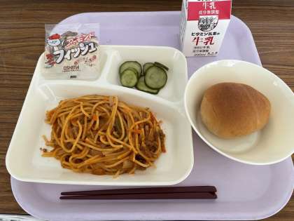 1/2黒糖パン、牛乳、スパゲッティミートソース、きゅうりのピクルス、アーモンドフィッシュ