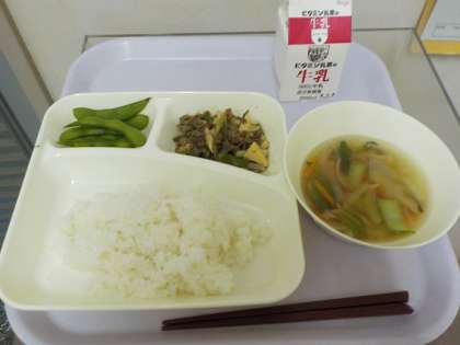ごはん、牛乳、チンジャオニューロウスー、ハムと野菜の中華スープ、えだまめ
