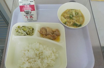 ごはん、牛乳、鶏肉のしょうゆマヨネーズ焼き、とうがんのみそ汁、切干しだいこんのゆずの香あえ