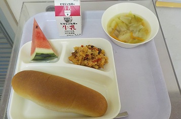 黒糖パン、牛乳、パエリア、ウインナーとキャベツのスープ、すいか