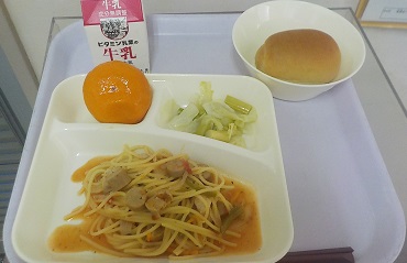 1/2黒糖パン、牛乳、チキントマトスパゲッティ、グリーンアスパラガスとキャベツのサラダ、みかん(冷凍)