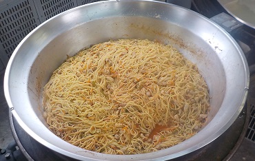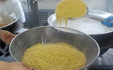 「チキントマトスパゲッティ」は、鶏肉、ウインナー、たまねぎ、トマト、にんじん、ピーマン、バジルを使用しています。ワインビネガーを使用したサラダは、さっぱりとした味わいでした。また、暑い時期にぴったりの冷凍みかんも登場しました。