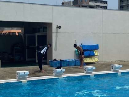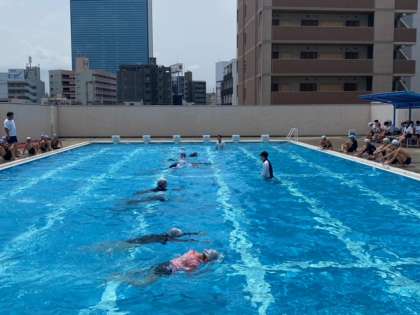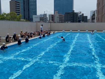 次に6年生がクロールと平泳ぎを教えてもらいました。4年生も6年生も、1時間だけで驚くほど上手に泳ぐことができるようになっていましたね。今日教えていただいたことを思い出しながら今後も練習していきましょう!!