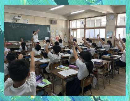 理科では,月や星の動きの学習をしています。さて、手をグーににぎって何をしているところでしょうか。