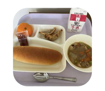 コッペパン、牛乳、あげぎょうざ、鶏肉ととうがんの中華煮、冷凍みかん、いちごジャム