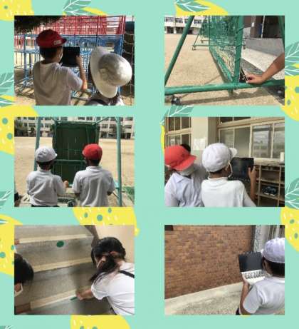 4年生の算数科では,四角形の学習をしています。学校の中のどこに垂直や平行が隠れているのかを探しにいきました。
