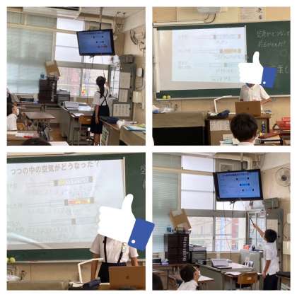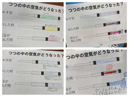 今日の理科は、「とじこめた空気と水」の学習でした。空気でっぽうの前玉はなぜ飛んだのかを、中の空気の様子を図や言葉にして、発表をしました。