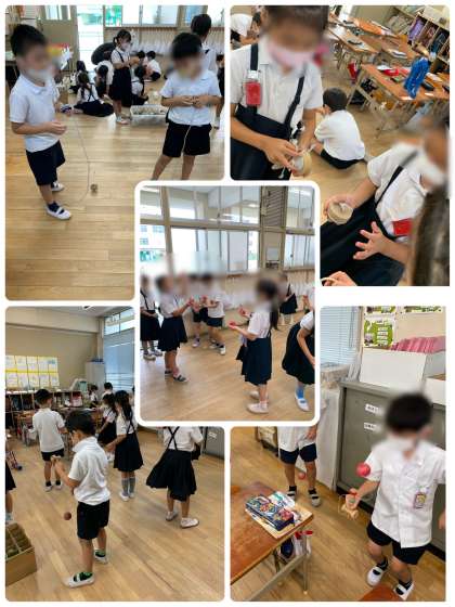 生活科では、「むかしあそび」をしました。けん玉やお手玉、こま回しに挑戦です。「できた!」「難しい!」さまざまな声が聞こえました。「むかしあそび名人」を目指してがんばります!