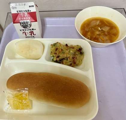 コッペパン、牛乳、豆乳マカロニグラタン〔米粉〕、トマトスープ、なし(二十世紀)、マーマレード