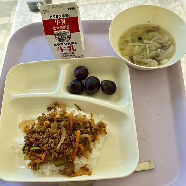 牛乳、野菜たっぷりカラフルライス、キャベツときのこのスープ、ぶどう(巨峰)
