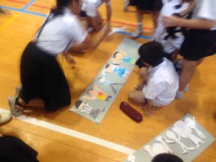 7月9日(木)の児童集会で、今年の手つなぎ人形を作成しました。ファミリーごとに、自分自身をえがいた絵の手つなぎ人形をつないで、はっていきました。