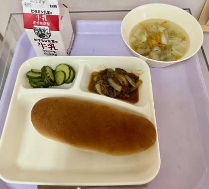 黒糖パン、牛乳、牛肉のデミグラスソース煮、スープ、きゅうりのピクルス