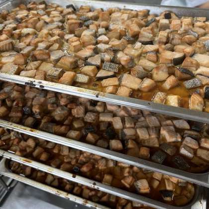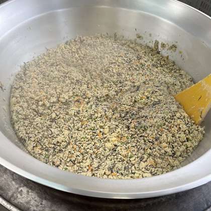 高野どうふのいり煮は、豚ひき肉、高野どうふ、にんじん、グリンピース、ひじきを使用しています。ひとつの鍋で、小・中学校分(約700人分)を作っています