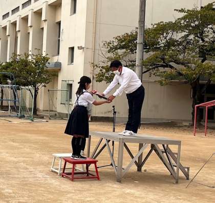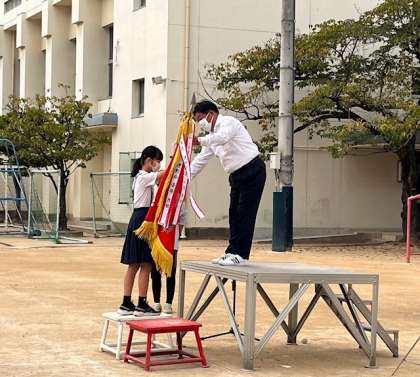運動会は2部で行ったため、今日の朝会で運動会の結果発表と優勝旗、準優勝盾の授与をしました。