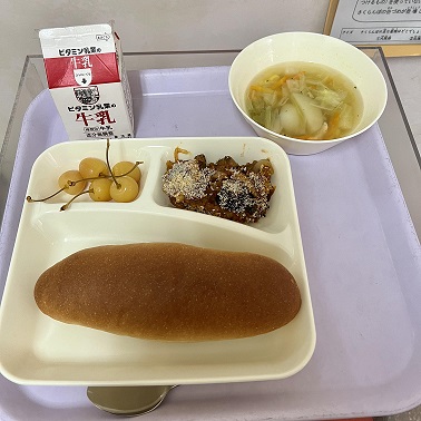 黒糖パン、牛乳、なすのミートグラタン、鶏肉と野菜のスープ、さくらんぼ(缶づめ)