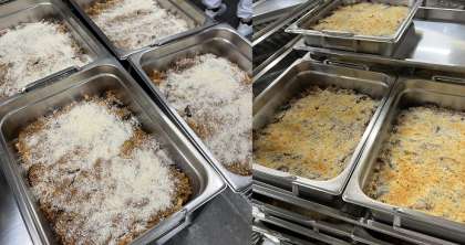 「なすのミートグラタン」は、材料をいため、味付けしたものをミニバットに入れ、パン粉をふってから焼き物機で焼いています。