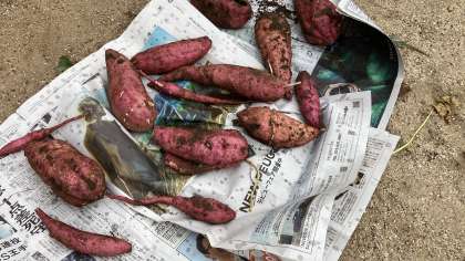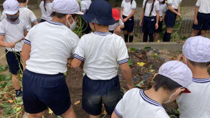1学期に植えたサツマイモを収穫しました。葉がたくさん生い茂っており、サツマイモまでたどり着くのが、なかなか大変でした。形も大きさもバラバラでした。