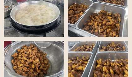 みそカツは1年に1回出るおかずです。2006年に初登場し、今年で17回目になります。給食では、豚ヒレ肉を使用し、手作りのカツにみそだれをかけています。みそだれも、愛知県発祥の八丁みそをメインに、給食室で手作りしていますよ(^^)