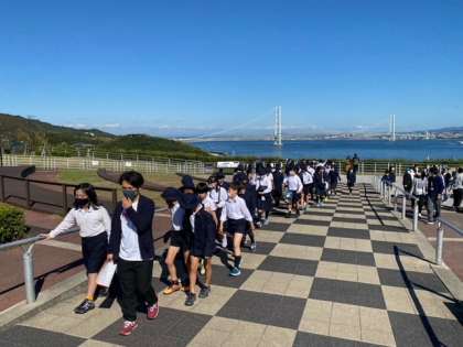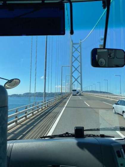 明石海峡大橋を渡り、淡路島に到着しました。淡路のサービスエリアで学級写真を撮り、次は北淡町震災記念公園へ向かいます!!